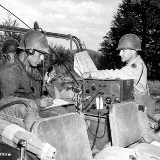 L-R: Radio operator, Pfc. Floyd Dann, Indian, whose real name is Loma Tuchyoma, Tuba City, Ariz.; T/4 Glenn Lance, McLeansboro, Ill.